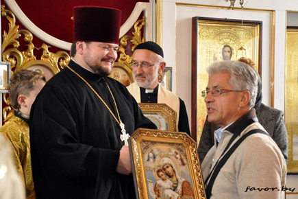 К визиту католической делегации было приурочено официальное принесение иконы с частицей мощей святого Амвросия Медиоланского, состоявшееся 14 октября 2011 года на Соборной площади г. Гомеля. Представители католической общины Милана поделилась святыми мощами Амвросия Медиоланского. Латинскую делегацию с мощами встретил… православный крестный ход во главе с секретарем Гомельского епархиального управления прот. Иоанном Ленделом. В этот же день – 14 октября 2011 года католическая делегация посетила Свято-Иоанно-Кормянский женский монастырь в г.п.Корма Добрушского района и присутствовала на праздничном богослужении, которое возглавил архиеп. Гомельский и Жлобинский Аристарх. В знак благодарности за принесенную в Гомельскую епархию святыню - икону с частицей мощей святого Амвросия, епископа Медиоланского, от имени православных верующих Гомельщины владыка Аристарх преподнес главе делегации дону Пьеру Анжело икону св. прав.Иоанна Кормянского с частицей его св. мощей.