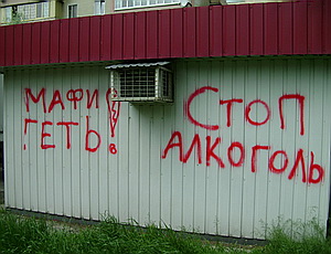 Родители детей, учителя, общественные организации безрезультатно годами воюют с барыгами. Следы борьбы отразились на стенах МАФа, красной аэрозольной краской «неуловимые мстители» оставили граффити: «СТОП АЛКОГОЛЬ!».