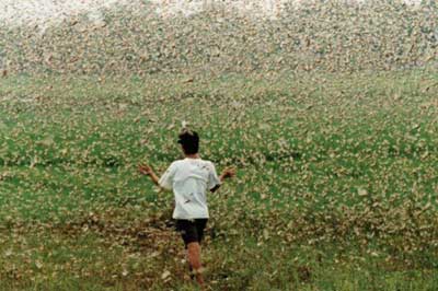 Такого казахстанские фермеры давно не помнят. Над полями висят настоящие тучи саранчи. Специалисты разводят руками, так как виновата погода. Аномально теплая весна и засушливое лето - как раз то, что нужно для размножения вредного насекомого. К тому же, ученые посчитали, что всплески рождаемости у саранчи повторяются каждые 12 лет. Нынешний год оказался как раз 12-ым в цикле.