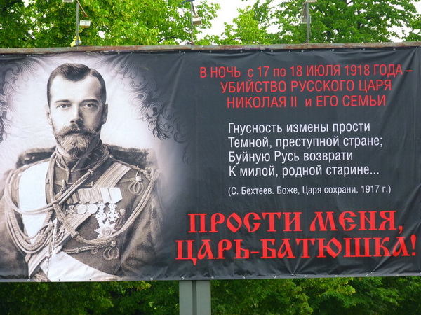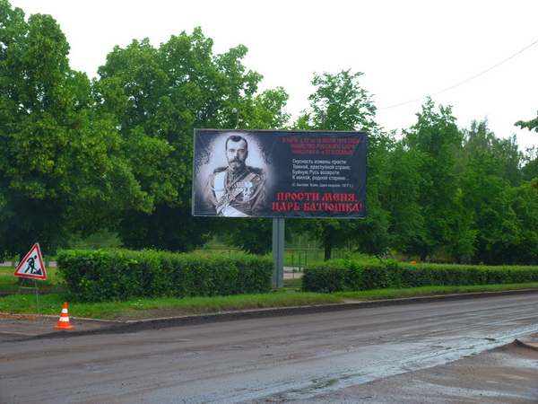Не все гладко проходит в богоугодном деле установки царских баннеров. Нам в редакцию сообщили, что данный баннер был снят досрочно неизвестными лицами, поскольку агентство, его установившее, заверило заказчиков в своей непричастности. Баннер должен был стоять в период с 13 до 20 июля, однако утром, 16 числа, его уже не было.