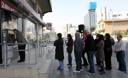 С утра у отделений второго по величине на острове Кипрского народного банка собираются люди, чтобы снять деньги в банкоматах, однако аппараты не выдают наличность, они заблокированы. Этот банк больше других пострадал в результате долгового кризиса в Греции и его судьба фактически предрешена.