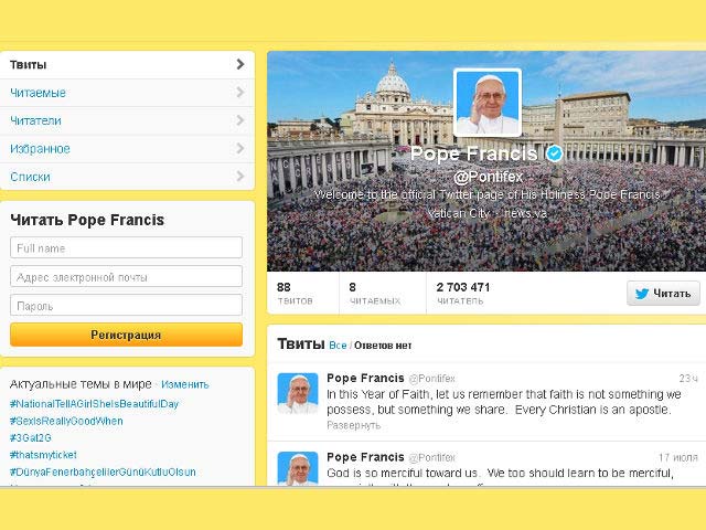 В Службе печати Святого престола уточнили, что все "твиты" внимательно прочитаны и одобрены Франциском, но сам текст набирает, конечно, не он, а специальный секретарь.