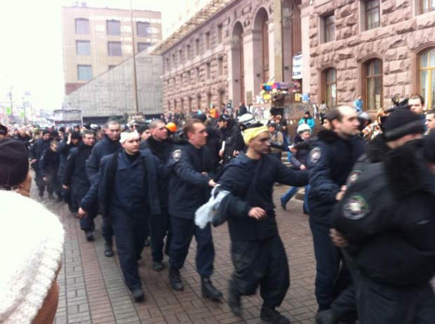 Они сдаются под гарантии безопасности. Самооборона Майдана им дает коридор через толпу и пытается обеспечить, чтобы их не побии, сообщает РБК-Украина. Бойцы идут с Грушевского через Европейскую площадь на Майдан. В плен попали, как отмечается, «рядовые военнослужащие», офицеров среди них не наблюдается.