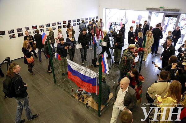 В революционной украинской столице, открылась выставка «Осторожно, русские». В украшенной триколорами клетке сидят дикие камуфлированные москали и бросаются на окружающих. С собой у них водка, оружие и портрет Путина.