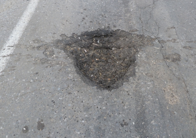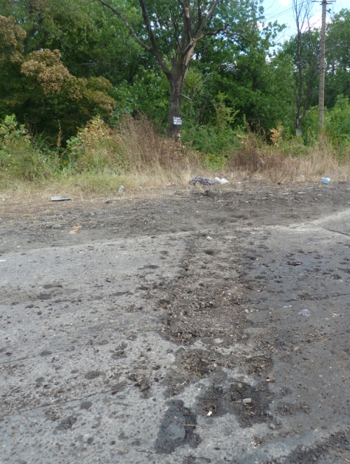 Борозда на асфальте указывает, что снаряд прилетел из кустов напротив
