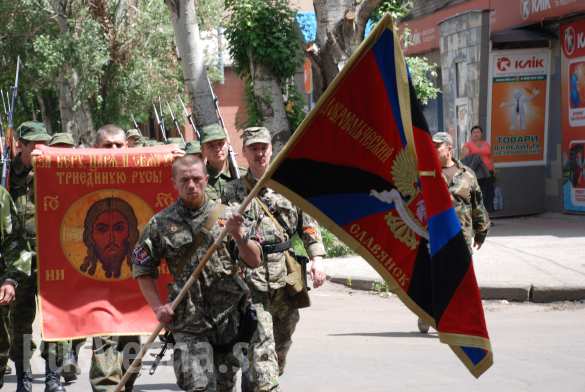 На видео освящение знамени 1-го добровольческого батальона в Свято-Воскресенском храме Славянска.