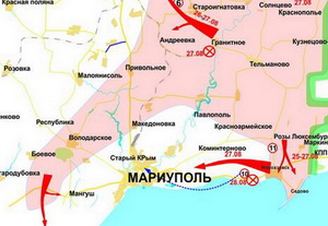 Ополченцы двинулись на Мариуполь от Гранитного, которое еще вчера было на границе территории, контролируемой ДНР. Армии республики удалось взять под свой контроль населенные пункты Старченково, Республика, Зеленый Яр, Боевое, Малиновка, Демьяновка, Стародубковка, Червоное Поле и Осипенко.