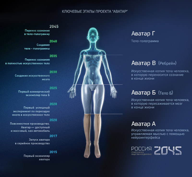 Первое направление посвящено разработке искусственной копии человека, управляемой мыслью с помощью нейроинтерфейсов. Разработчики назвали это тело «аватар» – по аналогии с одноименным фильмом Джеймса Кэмерона, хотя планируемый результат больше похож на «суррогата» из фильма Джонатана Мостоу. «Консерватизм и фантазия подвели создателей «Суррогатов», – отмечает Дмитрий Ицков, – они предложили негативный прогноз массового внедрения искусственных тел. Но суть технопроекта в фильме передана верно. Первый прототип «аватара» будет создан уже в течение ближайших четырех лет. Технологии, конечно, будут не на таком высоком уровне, как в фильме, но сам принцип возможности дистанционного управления копией человеческого тела через нейроинтерфейс будет реализован».