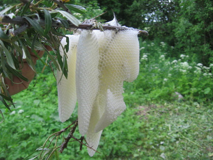 Трудяжки... Жужжащие в облепихеРешил выкосить траву в саду. Всё шло как обычно, но когда подошёл к кустам облепихи послышался какой-то странный шум. Выключил триммер, но шум не прекратился. Этакое лёгкое гудение. Источник гудения нашёл быстро. Это был пчелиный рой. Правда звук был слабоват. Обычно слетевший рой шумит громче. Быстренько сбегал за ящиком и стряхнул в него пчёл. И только тут обратил внимание, что это был не просто рой, а рой, занявшийся самостроем.Жалко, что сразу не сфотографировал пока все пчёлы были на месте. То что на фото - жалкая кучка пчёл на захотевших сидеть в коробке. Видимо я был невнимателен, раз не уследил за пчёлами и позволил им заняться самостроем. Гнездо имело хитрую конструкцию. Но дачную амнистию я решил не проводить и снёс незаконную постройку. Кстати, в в сотах уже был напрыск нектара. Еще немного и матка начала бы откладывать яйца. Теперь у пчёл новый, добротный дом. С регулярной застройкой, а у меня хитрая конструкция из веток и воска... ![]() ![]() ![]() ![]() ![]() ![]() ![]() ![]() ![]() ![]() ![]() ![]() |