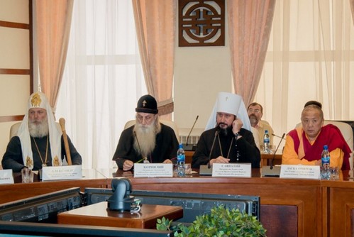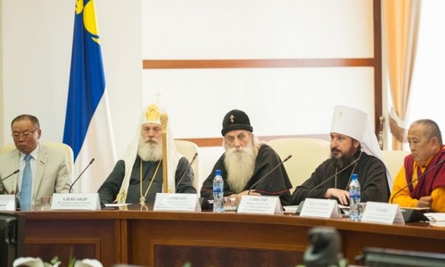 В рамках встречи состоялось несколько мероприятий: международная научно-практическая конференция «Старообрядчество: история и современность, местные традиции, русские и зарубежные связи», этнофорум «Всестарообрядческий съезд» и другие. 7 августа встреча открылась пленарным заседанием, прошедшим в конференц-зале здания правительства Республики Бурятия. С приветственными словами выступили глава Республики В. В. Наговицын, митрополит Улан-Удэнский и Бурятский Савватий (Антонов), старообрядческий «митрополит» Московский и всея Руси Корнилий («Русская Православная Старообрядческая Церковь» — РПСЦ), старообрядческий «патриарх» Московский и всея Руси (именуемый в сообщении ОВЦС МП «архиепископом») Александр («Русская Древлеправославная Церковь» — РДЦ) и дид-хамбо-лама Республики Бурятия Дагбо Очиров («Традиционная Буддийская Сангха России»). В пленарном заседании также приняли участие старообрядческий «епископ» Иркутско-Амурский и всего Дальнего Востока Патермуфий (РПСЦ) и старообрядческий «епископ» Сибирский Сергий (РДЦ). ![]() Пленарное заседание под знаком «эбер угалза» (рог барана). У бурят роговидный орнамент, удвоенный в виде якоря, является символом благополучия. ![]() 8 августа в здании Национальной библиотеки на трех тематических площадках проходили заседания этнофорума. Главная площадка была предоставлена для встречи старообрядческого духовенства. Активное участие в состоявшейся дискуссии принял секретарь Комиссии по делам старообрядных приходов и по взаимодействию со старообрядчеством, руководитель Патриаршего центра древнерусской богослужебной традиции РПЦ МП, бывший поморский наставник протоиерей Иоанн Миролюбов, который на следующий день выступил на научно-практической конференции с докладом «Старообрядные приходы Русской Православной Церкви и проблемы их становления». Многочисленные гости из старообрядческих общин России и зарубежья, ученые, представители государственных и общественных организаций обсудили актуальные вопросы сохранения и развития традиционной духовной и материальной культуры старообрядцев. Особый интерес более трех тысяч зрителей вызвал Международный фестиваль-конкурс фольклора старообрядческих художественных коллективов «Раздайся, корогод!», на котором выступили более 800 человек. Источник: Антимодернизм |
