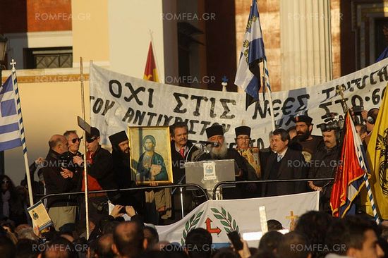 правительства «поработить свободу человеческой личности, введя тотальную систему электронного контроля над греками». На митинге присутствовали монахи со Святой Горы Афон и ряда греческих монастырей, священнослужители и миряне. После митинга состоялось шествие к греческому парламенту. Ранее против планов введения «карты гражданина» выступила Святая Гора Афон. 16 марта 2015 года Священный Кинот Святой Горы направил открытое письмо министру, уполномоченному по делам управленческой реформы, Георгию Катругалосу. По мнению Правления Святой Горы, вводимый Правительством «под предлогом борьбы с бюрократией и кризисом» новый электронный паспорт будет угрожать неприкосновенности личных данных и повлечет за собой «нарушение личных прав и свобод». «Очень просим вас принять во внимание, что электронная карта гражданина нивелирует уровень личности гражданина, превратив его в один из номеров в рамках системы государственного управления. Тем самым будет нарушена данная Богом свобода человеческой личности», - обратились к министру представители всех афонских монастырей. Святогорцы призвали Правительство отказаться от введения новых удостоверений личности. Фото: здесь и далее - портал Romfea.