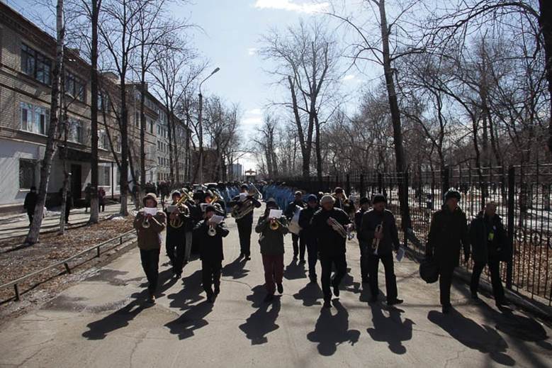 оркестра с воздушными шариками, флагами и транспарантом. Отличительной чертой
