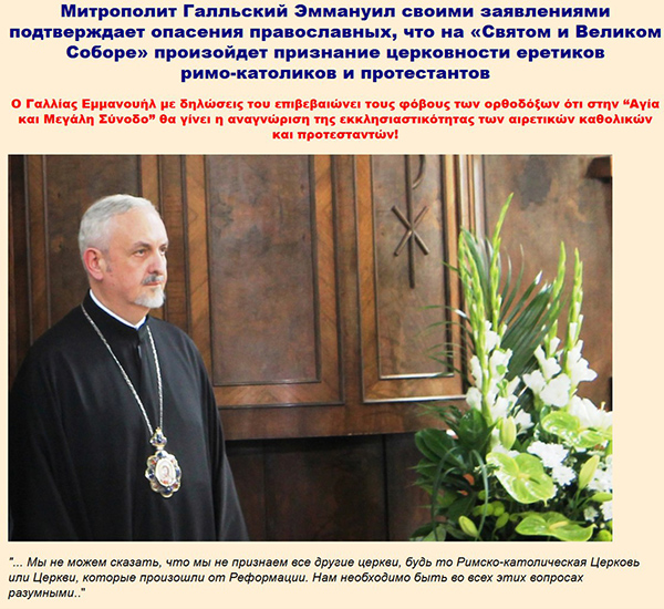 Митрополит Галльский Эммануил: «Мы не можем заявить, что не признаем других христианских Церквей»Опасения православных о том, что на т.н. Всеправославном соборе произойдет предательство Христа и Истины - небезпочвенны. С одной стороны, об этом свидетельствуют проекты итоговых документов собора, а с другой стороны, заявления организаторов и участников собора. Господи помилуй!