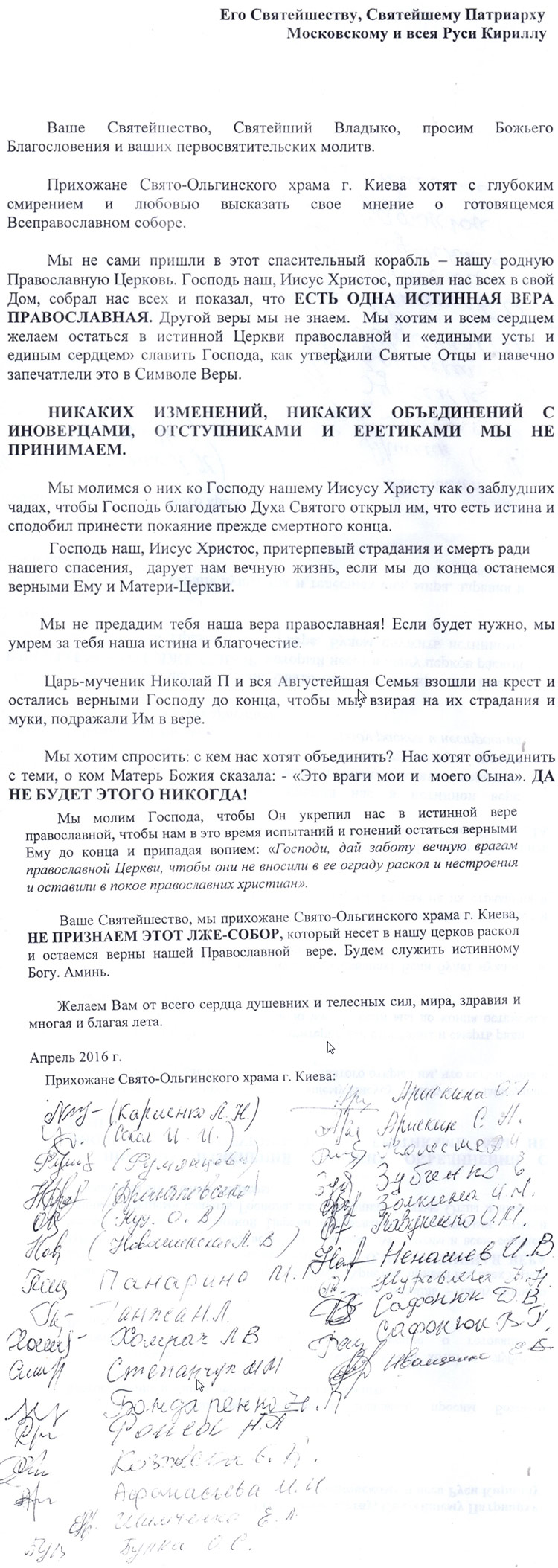 Письмо Православных к п.Кириллу