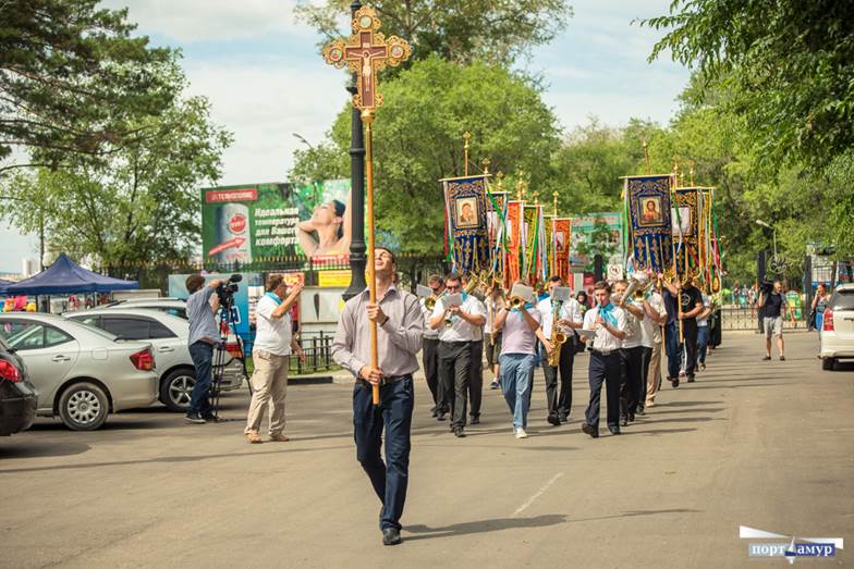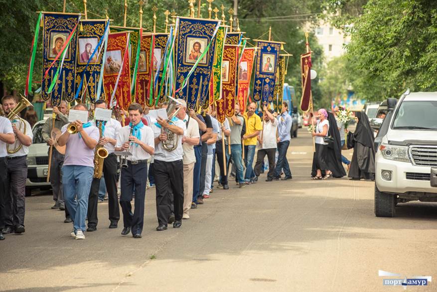 ход» в г.Благовещенске. За Крестом шествует оркестр, задавая тон шествию.