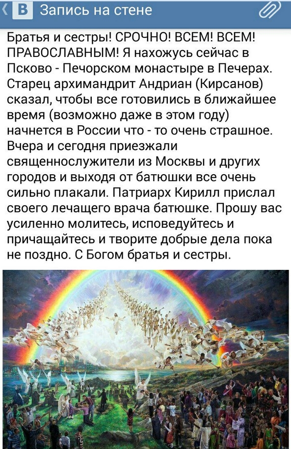 СРОЧНО! ВСЕМ! ВСЕМ! ПРАВОСЛАВНЫМ! Я нахожусь сейчас в Псково-Печорском монастыре а Печерах. Старец архимандрит Андриан (Кирсанов) сказал, чтобы все готовились в ближайшее время (возможно даже в этом году) начнется в России что-то очень страшное. Вчера и сегодня приезжали священнослужители из Москвы и других городов и, выходя от батюшки, все очень сильно плакали. Патриарх Кирилл прислал своего лечащего врача батюшке. Прошу вас усиленно молитесь, исповедуйтесь и причащайтесь и творите добрые дела пока не поздно. С Богом братья и сестры. ![]() Из архива 2011 года. Встреча со старцем Адрианом. Рассказ паломника о встрече со старцем в 2013 году