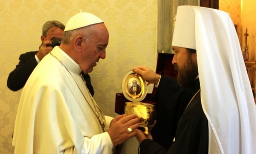 Волоколамский Иларион, сообщает служба коммуникации ОВЦС."Папа Римский был глубоко тронут драгоценным даром и просил передать Святейшему патриарху слова сердечной благодарности и братского приветствия", - говорится в сообщении. В ходе встречи стороны обсудили состояние православно-католических отношений после исторической встречи предстоятелей двух Церквей в Гаване в феврале этого года. Одной из центральных тем беседы стало трагическое положение христианского населения Ближнего Востока. Папа Франциск и митрополит Иларион отметили положительный опыт сотрудничества по оказанию помощи ближневосточным христианам во исполнение решений, принятых в ходе встречи на Кубе. "С обеих сторон была подчеркнута необходимость дальнейших консолидированных действий в ближневосточном регионе. Председатель ОВЦС познакомил Папу с инициативами Русской церкви по оказанию гуманитарной помощи страждущим гражданам Сирии и поблагодарил понтифика за его миротворческие усилия", - сказано в сообщении. Стороны отметили плодотворное развитие православно-католического