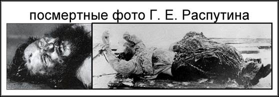 Распутин говорил близким, что не доживет до 1917 г. и умрет в страшных мучениях. Перед тем, как поехать с Ф.Ф.Юсуповым в его дом, он сжег всю переписку, одел новую рубаху. Убивали мученически: били плетью с концами, выбили глаз, вырывали клочья волос, сделали надрез под левым подреберьем (по образу Христа). Потом живого бросили в прорубь, т.к. легкие были полны водой. Все это показало следствие вопреки официальной версии – расстрелу, о котором рассказывали заявившие себя убийцами (но по их показаниям видно, что они не знали, какая рубаха у Распутина, т.е. не видели его без верхней одежды). Нашли недалеко от проруби подо льдом. Пальцы правой руки, освободившейся от веревки, были сложены в крестное знамение как символ победы над смертью.