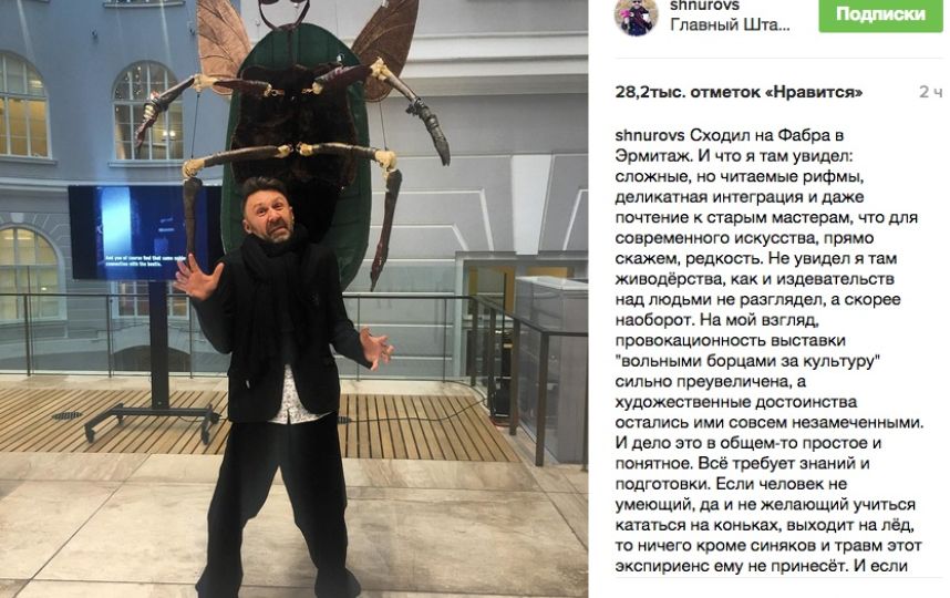 Матерщинник и скандалист Сергей Шнуров, ведущий на центральном телевидении шоу "Про любовь", опубликовал фото с выставки Яна Фабра в Эрмитаже и высказался в поддержку художника.