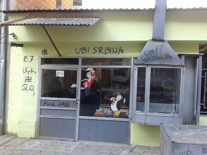 На стене школы «Вук Караджич» и амбулатории, которая находится в соседнем здании, рядом с церковью, появилась надпись на албанском «Зарежь серба». Также еще одна надпись вульгарного содержания, оскорбляющая память умерших, появилась на киоске, находящемся на той же улице. Гнилане – населенный пункт в Автономном крае Косово и Метохия Республики Сербия. В 1999 году власти Сербии потеряли фактический контроль над Гнилане. В марте 2004 город был одним из крупных центров сербских погромов на территории Косова и Метохии – все сербы были выгнаны из города, а их дома сожжены. На улице, где произошел инцидент, располагается импровизированный рынок, на котором сербы продают сельскохозяйственную продукцию. ![]() |