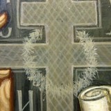 преподобного Серафима Вырицкого. Икону было решено передать «игумену Митрофану в Варзугу». Но вскоре выяснилось, что отец Митрофан уже стал епископом, и находится в г. Североморске, и икону надо передавать туда. Однако к этому времени на иконе стал проявляться «дефект» – проступать некий светлый круг в центре креста, который на одежде преподобного. Автор иконы предположила, что это проявляется сучок на доске, что было категорически отвергнуто столяром, поскольку сучков на доске не было. К моменту доставки иконы в Североморск загадочный круг стал превращаться в живописный Венец висящий на Кресте. Чудо явления нерукотворенного Тернового Венца Христова на Святом Кресте очевидно всем и радость от этой удивительной Божьей милости испытывает каждый молящийся перед этой иконой. В настоящее время икона находится в храме Веры, Надежды, Любови и матери их Софии г. Североморска. |