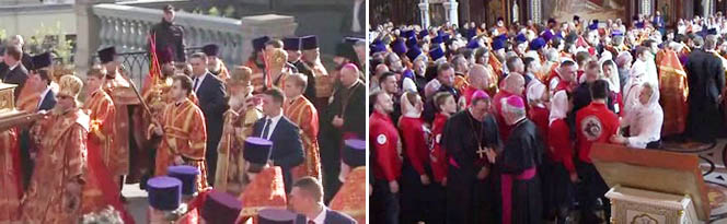 ОСКВЕРНЕНИЕ СВЯТОЙ ПАМЯТИ СВЯТИТЕЛЯ НИКОЛАЯ... Враги Христа, еретики-католики принесли мощи святого православным. (ВИДЕО)Еретик и богоотступник п.Кирилл верит, что "в будущем христиане разных конфессий снова объединятся в одну Церковь", - пишут религиозные СМИ после торжественной встречи частицы мощей святителя Николая Чудотворца в Москве. В воскресенье, 21 мая, накануне празднования перенесения нетленных мироточивых останков Николая Чудотворца из Мир Ликийских в Бари, в 1087 году, состоялось очередное "эпохальное событие" в нашей Церкви. Тиражируется новость о том, что якобы впервые за 930 лет мощи Божиего Угодника покинули Италию и приносятся в Россию. Однако, как показано в видеотрансляции (ниже), доставлена была лишь частица, какую мы и так можем видеть и прикладываться во многих храмах Русской Церкви. Принесение же частицы из Бари было организовано торжественным образом со стороны светских и религиозных властей. Сопровождал святыню, как и предполагалось, папский легат - "архиепископ" Франческо Какуччи, а также настоятель базилики в Бари падре Чиро Капотосто и секретарь папского "совета по христианскому единству" Андреа Пальмиери. На видеозаписи видно, что во время внесения мощей в храм Христа Спасителя в нескольких метрах от патриарха Кирилла шествует католический служитель. ![]() Внутри храма после торжественной встречи с молебном Николаю Чудотворцу патриарх произнес речь, в которой, в частности, поблагодарил католическую делегацию и лично "ваше высокопреосвященство архиепископа" Франческо и "членов делегации римо-католической церкви", многозначительно отметив, что "наверняка, на жизни нашего народа и Церкви отразится это воистину историческое событие". Напомним, что осуществление этого "великого дела" стало возможным, как везде это преподносится, после "эпохальной" Гаванской встречи патриарха Кирилла с папой римским. Далее Предстоятель РПЦ произнес следующие слова по отношению к католикам: "Сегодня мы еще разделены, поелику богословские проблемы, пришедшие к нам из древности, не дают возможности нам воссоединиться... Это объединение христиан может произойти не по их усилиям, каким-то церковно-дипломатическим шагам, богословским соглашениям, а только если Дух Святой снова соединит всех, кто исповедует имя Христово... Верим, что святитель Николай, слышащий молитвы христиан Востока и Запада, предстоит пред Господом, в том числе и прося у Него соединить Церкви воедино". "Да хранит Господь и помогает в прохождении непростых исторических путей христианам Востока и Запада", - добавил патриарх. Таким образом, празднование Николая Чудотворца - этого Правила веры и Образа кротости для православных - ведомый современными экуменистами и католиками-иезуитами русский народ, к великому прискорбию, отметил антиканонической молитвой в присутствии и с подачи еретиков в храме, против единения с которыми в свое время Святитель Николай не постеснялся освятить руку свою ударом... |