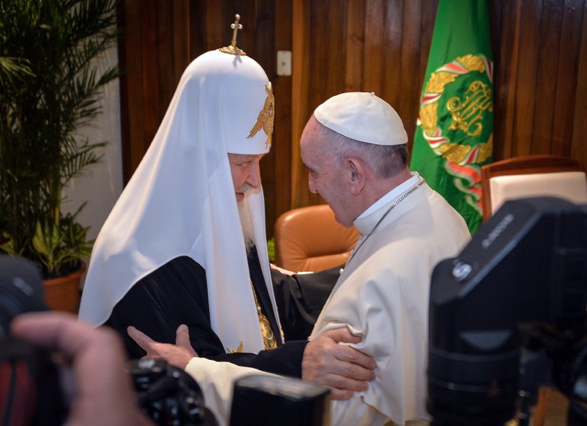ОТ РЕДАКЦИИ: Дорогие во Христе братья и сестры! Просто поразительно насколько полно отступление от Христа поразило практически весь епископат и священство Русской церкви. Но не только их, но и мирян, которые молчат или даже не интересуются чистотой исповедования Православной веры своим священноначалием и священством. И это не снимает с них ответственности. Православные христиане обязаны и должны непрестанно исследовать эти вопросы! В противном случае они, вместе со своими отпавшими от Христа архиереями и священниками, окажутся в церкви антихриста, с его начертанием и билетом в один конец - в АД на веки вечные! Господи помилуй! Ну как можно поминать пред престолом Божиим богоотступника и еретика лжепатриарха Кирилла? Как можно его поминать и называть пред Богом своим отцом, если он проповедует церковь антихриста, если он тащит в неё всю Русскую церковь, если он утверждает, что все религии ведут к одному богу творцу и т.п.?! Ведь никто не оправдается пред Христом за свое предательство послушанием гундяевским еретикам и богоотступникам... НЕЛЬЗЯ ИХ ПОМИНАТЬ! НЕЛЬЗЯ ЕГО НАЗЫВАТЬ СВОИМ ОТЦОМ, т.к. отец его диавол! Братья и сестры, сами изучайте эти материалы и другим давайте... Благослови вас Господь! «Гаванская декларация» - это самый еретический документ патриарха. Именно он послужил последней жирной «точкой» в моем решении прекратить поминовение еретичествующего патриарха, т.к. в документах критского лжесобора ересь завуалирована двусмысленными выражениями, хотя и любому понятно о чем идет речь. Здесь же, во многих местах, ересь «сияет» во всей своей «красоте». Грешный монах Варсонофий (Богославский) Почти два года прошло с момента апостасийной встречи патриарха Московского и всея Руси Кирилла с папой Франциском в аэропорту города Гаваны. Результатом этой встречи было подписание так называемой «Гаванской Декларации» или «Совместного заявления…». После этого уже было несколько православных комментариев на этот документ в печати и интернете, более или менее полных. Возможно и мы кое-что, в меру данного нам от Бога видения, добавим к сказанному прежде.На последнем архиерейском соборе Русской Православной Церкви, во вступительной своей речи, патриарх Кирилл превознес эту встречу словами: «Высокая степень взаимопонимания была явлена в ходе моей встречи с Папой Римским Франциском 12 февраля в Гаване», ― сказал Его Святейшество, отметив, что в России и в мире это событие имело очень широкий положительный резонанс. Патриарх выразил уверенность, что встреча на Кубе стала важным шагом на пути к решению наиболее актуальных вопросов современности совместными усилиями двух крупнейших Церквей христианского мира». Помянул патриарх и «Декларацию» правда, как чисто дипломатический документ: «В Совместном заявлении, которое мы с Папой Франциском подписали по итогам встречи, содержится призыв к мировому сообществу сделать все возможное для прекращения насилия в ближневосточном регионе…». Давайте вернемся к тексту этого апостасийного документа и постараемся проанализировать его в свете Священного Писания, священных канонов и святых отцов. Насколько это «заявление» дипломатическое и насколько – еретическое. Полностью цитировать «декларацию» не будем, чтобы не затруднять читателя. Полный текст этого документа найти не трудно на 