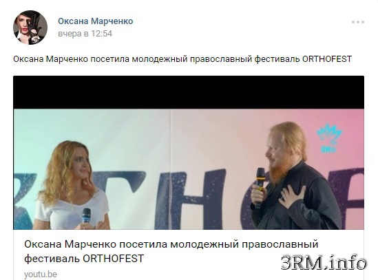 Братья и сестры! Идет мощнейшая волна отступления в нашей Русской церкви. И не забывайте, что рыба гниет с головы. Во главе стоит богоотступник и еретик, и все молчащие в ответ на все его преступления против Бога и Церкви, становятся соучастниками этого богоотступничества. Поэтому мы и видим епископат, священство и мирян с помраченным умом и сердцем. Господи помилуй! Бывшая ведущая популярных украинских шоу «Х-фактор» и «Украина мае талант», а также ведущая с 2007 года собственное шоу «Шоу Оксаны Марченко» выступила на молодежном православном фестивале ORTHOFEST, о чем отчиталась на своем Ютуб-канале 31 июля (видео ниже).