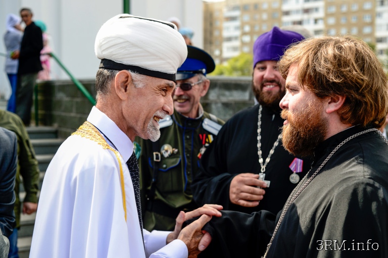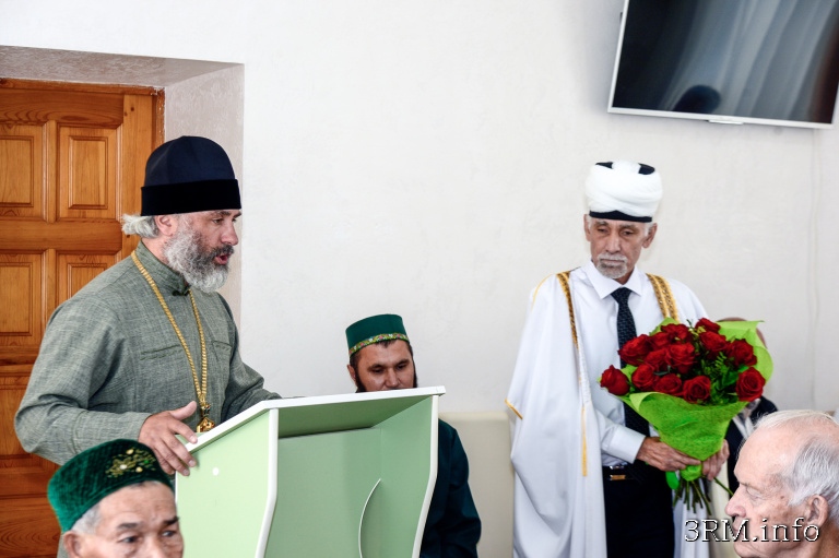 Первым с поздравительным адресом перед исламистами выступил отец Димитрий Кондраков, который в частности сказал: "Мы живем в братской любви, особенно в городе Салавате, православная Русская Церковь и мечеть — это братская любовь у нас здесь. Мы без мечети и они без нас ничего не делают. Благодарим Вас, Рамиль Хазратович, что Вы у нас есть, а всем здоровья, благополучия, любви! С Праздником!" Затем торжественную часть праздника продолжил председатель еврейской общины Салавата Борис Кац. Еврея на трибуне сменил муфтий соборной мечети Рамиль Насыров. Затем слово взял Салаватский Владыка Николай (Субботин). В своём выступлении Владыка поздравил муфтия и всех присутствующих с