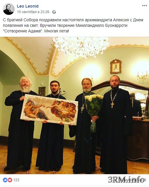 БЫТОВОЙ ПАПИЗМ... В подарок священнику голого мужикаЗаместитель председателя отдела по взаимодействию с вооруженными силами и правоохранительными учреждениями Санкт-Петербургской Епархии, помощник начальника Военной академии связи по работе с верующими военнослужащими и ключарь Никольского морского собора в Кронштадте иеромонах Леонид (Лео)(Маньков) рассказал в своём ФБ о врученном подарке на День «сотворения» настоятеля собора архимандрита Алексия (Ганьжина). Единственным, кто немного удивился преподнесенному подарку, стал председатель отдела по делам молодежи С-Петербургской епархии о.Константин Головатский, который назвал его «оригинальным». Остальных отцов и матушек вид обнаженной мужской натуры творения папского художника нисколько не смутил. ![]() ![]() ![]() |