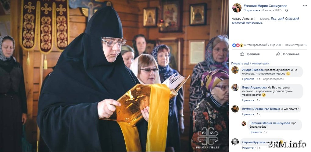 ТАКОГО ЕЩЕ НЕ БЫЛО... Чтица в мужском монастыреПрим.Ред. - Дорогие братья и сестры! Мы с вами являемся свидетелями широкомасштабной апостасии в нашей Русской церкви, захваченой еретиками-экуменистами и модернистами во главе с богоотступником лжп. Кириллом. Они в нарушение всех канонов и правил проводят основательное разрушение многовекового традиционного церковного уклада. Да запретит им Господь! Монахиня-выкрест Евгения (Мария) Сенчукова из Якутской епархии, будучи епархиальным пресс-секретарем и проректором семинарии, активно занимается топорной ломкой стереотипов. На этот раз клоунесса «пришла со своим уставом» в Якутский Спасский мужской монастырь читать Апостол «про братолюбие», о чем отчиталась в своем Фейсбуке. А самое важное то, что монастырское начальство позволяет ей разрушать монастырскую жизнь в обители. Да запретит им Господь! Важное уточнение: в Якутске с 2010 года действует женский монастырь в честь Покрова Пресвятой Богородицы, в котором 16 насельниц, но «Машу» почему-то тянет именно в мужскую обитель... Проректор Якутской духовной семинарии инокиня Мария (Евгения) (Сенчукова) (на фото) считает житие святых Петра и Февронии сказкой, а их самих выдуманными персонажами. ![]() ![]()