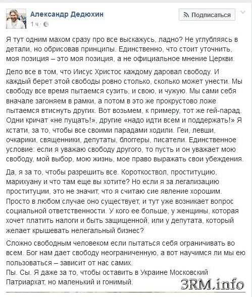 ВРАГ ХРИСТА - ДРУГ ЭКУМЕНИСТАМ... Легализация раскола на Украине идёт полным ходом3 ноября в Стамбуле лжепатриарх-масон Варфоломей наградил крестом скандального «священника» УПЦ КП Александра Дедюхина, который сопровождал Петра Порошенко в ходе его визита на Фанар — сообщается на сайте «Союза православных журналистов». Фотография, на которой Предстоятель Константинопольской Церкви вручает раскольнику подарочный патриарший крест, Дедюхин опубликовал на своей странице в Facebook.Данное событие специально для СПЖ прокомментировал замглавы ОВЦС УПЦ протоиерей Николай Данилевич. По его словам, ранее в разговорах с представителями УПЦ Патриарх Варфоломей особенно подчеркивал, что лично не встречается и не принимает раскольников. «Патриарх подавал это как пример соблюдения принципов каноничности и непризнание им раскольников, – отметил отец Николай. – Последних неофициально и непублично принимали только его представители. Теперь, можно говорить, что Патриарх Варфоломей уже считает раскольников каноническими, раз не просто официально принимает одного из них, хотя и в составе государственной делегации, но и дарит крест, что можно расценивать как признание раскольника каноническим священником». Ранее «священник» УПЦ КП Александр Дедюхин написал в своем Facebook, что даже если предоставление Томоса отложат, для Киевского патриархата это ничего не изменит. Также Дедюхин известен своими скандальными заявлениями о том, что участники Всеукраинского крестного хода являются «московскими вампирами». Кроме того, в прошлом году раскольник выступил за легализацию оружия, наркотиков и проституции. «Да, я за то, чтобы разрешить все. Короткоствол, проституцию, марихуану и что там еще вы хотите?» – написал на своей странице в Facebook священнослужитель Киевского патриархата Александр Дедюхин. «Дело все в том, что Иисус Христос каждому даровал свободу. И каждый берет этой свободы ровно столько, сколько может унести, – рассуждает представитель КП. – Мы свободу все время пытаемся сузить, и свою, и чужую. Мы сами себя вначале загоняем в рамки, а потом в это же прокрустово ложе пытаемся втиснуть других».