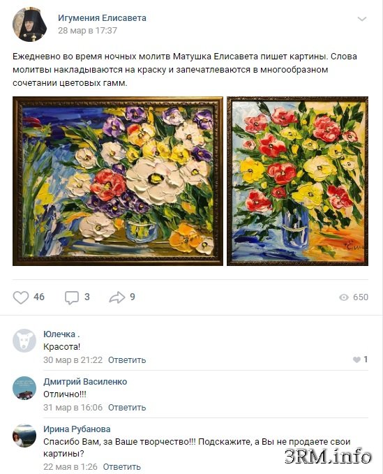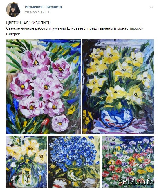 МОНАХИ БУДУТ - КАК МИРЯНЕ... Ночная жизнь игумении Елисаветы"В последние времена монахи будут - как миряне, а миряне - как бесы". Антоний Великий Настоятельница Свято-Елисаветинского женского монастыря Черняховской епархии Калининградской митрополии игумения Елисавета (Кольцова) все ночи напролёт молится, о чём регулярно отчитывается на своей странице ВКонтакте. В результате усиленных всенощно-бденных молитв на свет появляются пост-импрессионистские полотна с изображением цветочных сюжетов. Смеем предположить, что следствием такого «духовного» творчества могло стать молитвенное правило на основе ново-измышленного Межсоборным присутствием молебна о «сохранении Божьего творения». В случае соблюдения традиционных монашеских норм и правил скорее всего на свет появлялись бы святые образа. ![]() ![]() |