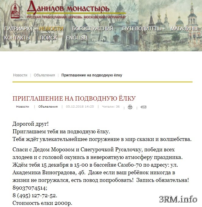 МОНАХИ, КАК МИРЯНЕ... За ваши деньги - любые удовольствия. Очередная новость из серии «Знамения времен»Прим.Ред. - Дорогие во Христе братья и сестры! Святой Антоний Великий говорил: "В последние времена монахи будут - как миряне, а миряне - как бесы". Это мы сейчас и видим. Мы уже неоднократно касались этой больной темы. Ну разве дело монастыря и монахов устраивать подводные елки с волшебствами и русалками? Господи помилуй! Братия Данилова монастыря приглашает детишек на «подводную елку». Всего за 2000 рублей юным водолазам предлагается погрузиться в мир сказки и волшебства и спасти Русалочку от злодеев. Ну, что тут скажешь? Дружно идем ко дну, братия!