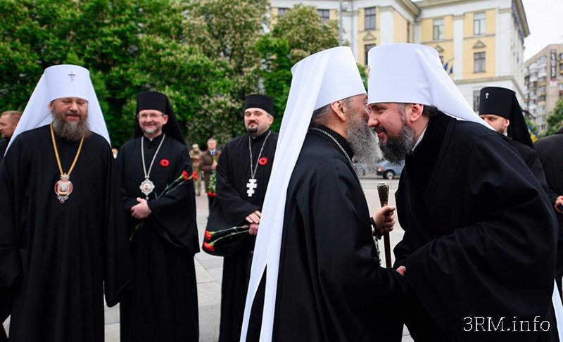 НОЖ В СПИНУ ПРАВОСЛАВНЫМ! Публичное предательство Христа и дружба с Его врагами. (ФОТО)Прим.Ред. - Дорогие братья и сестры! Как скорбно смотреть на эти фото, на которых предстоятель канонической УПЦ МП м.Онуфрий ручкается, обнимается и чмокается с главным раскольником ПЦУ Думенко, с врагом Христа и Божией Матери. И ведь это не какая-то частная встреча у кого-то на дне рождения, а это официальная церемония. А потому своим примером лжм.Онуфрий подает душепагубный пример всем епископам, священству и мирянам, что дружба с погибающими в своей нечистоте и богомерзкой раскольнической жизни, богоотступниками - это нормально и правильно. Кроме того, в то время, когда на Украине идет жесткое противостояние, нередко доходящее до физического насилия, православной паствы УПЦ МП с раскольниками ПЦУ, стермищимися захватить наши храмы, лжм.Онуфрий предает свою паству и дружится с главой сатанинского сборища - ПЦУ. Поэтому не нужно удивляться, что священство и миряне переходят из УПЦ МП в сатанинскую ПЦУ. Если предстоятель церкви с кем-то устраивает братские обнимашки, то простой народ это тем более будет делать. Братья и сестры! Так стоит ли нам удивляться происходящим бедам и скорбям на Украине и в России, а в скором времени и в Белоруссии? Ведь мы же все - одно целое, одно Тело Христово. И все мы соборно предаем Христа, т.к. священноначалие творит беззакония, а все остальные трусливо и теплохладно молчат. Господи помилуй! Предстоятель Православной церкви Украины митрополит Епифаний и глава Украинской православной церкви Московского патриархата митрополит Онуфрий встретились 9 мая в Киеве. Их короткий разговор состоялся во время церемонии чествования памяти погибших по случаю 74-й годовщины победы над нацизмом во Второй мировой войне. Соответствующие фотографии опубликовала пресс-служба ПЦУ. Епифания сопровождал наместник Свято-Михайловского Златоверхого монастыря архиепископ Вышгородский Агапит. Встреча Епифания и Онуфрия произошла вблизи аллеи Воинской Славы и могилы Неизвестного солдата. На фото видно, что предстоятели и другие священники тепло поприветствовали друг друга. ![]()