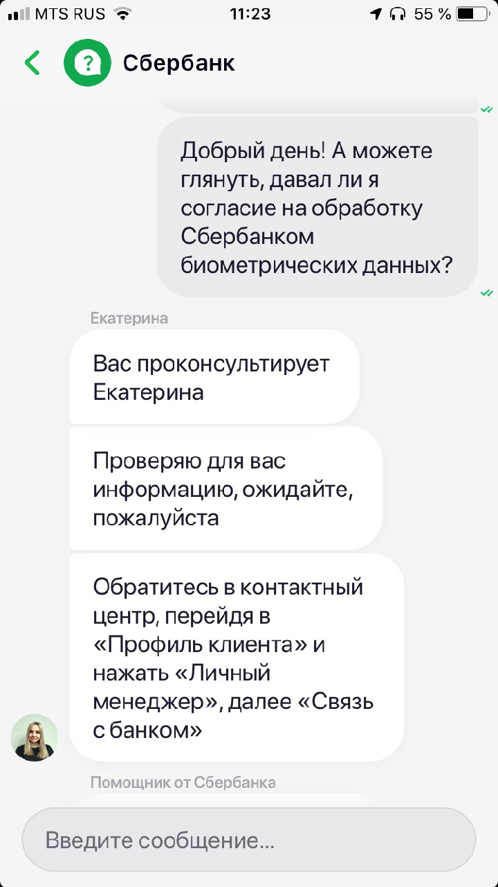 Обращение в Сбербанк «Блокчейн», «бигдата», «машин лернинг» не помогли ассистенту в чате банка узнать, давал ли я согласие на обработку биометрии. Меня отправили звонить на горячую линию.