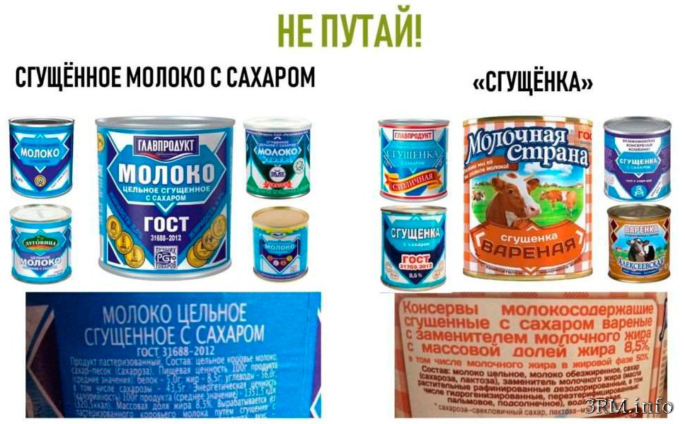 ФЕЙКОВЫЕ ПРОДУКТЫ... как не вестись на развод в магазинах?![]() ЧТО ЕЩЁ ЗА ФЕЙКОВЫЕ ПРОДУКТЫ? Несколько лет назад в России запретили указывать на этикетке названия, которые не соответствуют продукту и ГОСТу, по которому он изготовлен. Например, теперь на спредах нельзя писать слово “масло” и даже “сливочно-растительное масло”. И это было сделано потому, что рынок оказался просто завален фальсификатом, а потребители массово жаловались на то, что покупали вроде бы масло…но это оказывалось совсем не масло. Однако производители не настолько просты, чтобы вот так честно писать всю правду-матку на этикетке. Ведь, согласитесь, никто не купит тот же спред, если это будет написано большими буквами. Поэтому компании стали писать на этикетках то, что близко нашему сердцу и навевает приятные воспоминания или вкусовые ощущения. Я назову такие продукты фейковыми. Не потому что они плохие, а потому что пытаются выдать себя за то, чем они не являются. Представленные ниже продукты приведены не в рекламных целях и не с целью критики их вкусовых или иных свойств, а исключительно ради примера содержимого этикеток. 1. СЛИВОЧНОЕ МАСЛО Производители масла, пожалуй, на первом месте по фейковым названиям. Наверняка, Вам на полках попадались названия “крестьянское”, “фермерское”, “вологодское”… но без слова “масло в конце”. Увы, всё это спреды, содержащие растительные жиры. ![]() Не верьте блестящим кругляшкам ГОСТов, настоящее сливочное масло обязательно должно содержать слово “масло” на упаковке. В противном случае такого производителя могут засудить. 2. СГУЩЁННОЕ МОЛОКО Если Вы после прочтения этой статьи зайдёте в какой-нибудь крупный гипермаркет, то Вы очень удивитесь тому, что “молока сгущённого с сахаром” на полках почти нет. На весь прилавок размером со стену ну разве что пара-тройка банок найдется. Зато в изобилии будут представлены “сгущенКИ” и “варёнКИ”. То, что производитель называет “сгущёнкой”, сильно отличается от настоящего сгущённого молока с сахаром, в которой должны содержаться…только молоко и сахар. ![]() Никогда не ведитесь на сине-белый дизайн упаковки. Переверните баночку и почитайте состав такой “сгущенКИ”. Наверняка вы увидите, что это молокосодержащий продукт с заменителем молочного жира. Интересно, что крупные бренды производят и то, и другое. Например, в ассортименте известной фирмы “Главпродукт” есть и цельное молоко, сгущенное с сахаром, и сгущёнка с сахаром. Причём стилистически банки очень похожи. 3. ТУШЁНОЕ МЯСО Мы привыкли к слову тушёнка. Этим и пользуются продавцы, которые не укладываются в рамки действующих ГОСТов. На прилавках полным полно консерв с надписью “тушёнка”, хотя настоящий продукт должен называться “тушёная говядина” или “тушёная свинина” и никак иначе. Состав “тушёнок” содержит в себе намного больше ингредиентов, помимо мяса и специй. Там будет содержаться крупа, соевый белок и жир, пальмовое масло. Кроме того, массовая доля мяса и жира, скорее всего, будет ниже, чем того требует ГОСТ. ![]() 4. КИСЛОМОЛОЧНЫЕ ПРОДУКТЫ Вот тут у производителей самое настоящее раздолье. Можно смело заявить – больше половины всего прилавка в супермаркете – это фейковые продукты, которые “косят” под натуральные. Производители настойчиво пытаются избежать на упаковке слова “творог” и заменяют его на слово “
