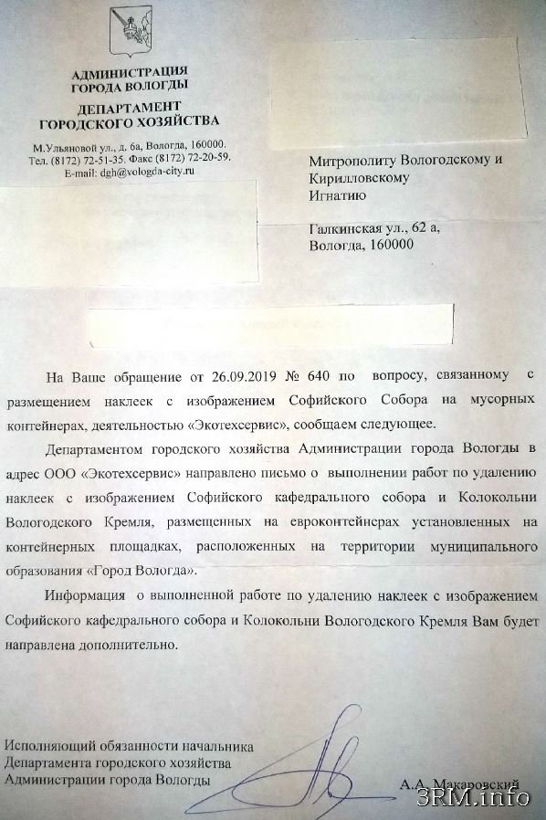 ПРАВОСЛАВНЫЕ ВОЛОГДЫ, ДЕЙСТВУЙТЕ! Избавьте свой город от кощунства. Письмо в Редакцию. (ВИДЕО)ПИСЬМО В РЕДАКЦИЮ: Уважаемая редакция, вот что произошло после того, как кощунственные наклейки с изображением храма Святой Софии появились на мусорных баках ООО «ЭКОТЕХСЕРВИС». Пришлось пообщаться с этой организацией. Первый раз руководителя не было и пришлось разговаривать с диспетчером. Это не помогло. Второй раз разговаривал уже с Яковым, который представился руководителем. На словах он подтвердил, что понимает, о чём речь, что наклейки являются кощунственными и спросил: «Откуда нужно убрать»? Но когда услышал, что нужно убрать отовсюду, делать это отказался. Что интересно, разговаривал ещё с тремя батюшками, мол, что делать, храм на мусорных баках изображают. Ответы на повал не убили, привыкли уже ко всякому, но лёгкий шок был. Первый задумался и выдал с улыбкой, что, мол, если на баке церковь изображена значит где-то неподалёку есть храм. Правильно идём, значит. Второй сказал, какое тебе дело, ты ведь не наклеивал. Пусть отвечают те, кто клеил. И только третий сказал, что это кощунство. Не буду углубляться в детали, короче, результатом дальнейшей деятельности было письмо из департамента городского хозяйства Администрации Вологды с обещанием убрать наклейки (см.ниже). И вот прошёл почти месяц, но наклейки никто не убирает. Пока как-то сами. Примечательно то, что произошло вскоре потом. А потом в Вологде произошло невероятное! Наводнение осенью! Такого никогда не было. Не было никогда. Смотрите ниже сами. Поневоле приходят на ум вопросы: почему, зачем, за что? И обращаясь к святоотеческому наследию, мы можем обнаружить следующее: Свт. Иоанн Златоуст: "Возлюбленный, когда видишь умножающиеся бедствия, не унывай, но еще более ободряйся. Бог попускает им быть для того, чтобы прогнать твою беспечность, чтобы пробудить тебя от сна". Свт. Иоанн Златоуст: "Бог силен прекратить все бедствия, но пока не увидит совершившегося обращения, не прекращает скорбей". Свт. Василий Великий: "Из случающихся с нами бедствий иные постигают в наказание за грехи, другие - для исправления нравственности в искушаемых, а иные - для истребления безнадежных". Поэтому, вологжане, давайте будем бояться стать такими «безнадёжными». Давайте уберём изображение храма с мусорных баков. Мусор выносят все! Очень вас прошу. С уважением, р.Б. Петр Ситуация с подтоплением Вологды: 2019.11.07 Потоп в Вологде. Лукьяново Обрушение берега в Вологде Осенний паводок: в Вологде затопленной оказалась железная дорога Повышение уровня воды: Вологда ![]() Публикация от 21 сентября 2019 года СТРАШНОЕ КОЩУНСТВО... ЕГО НУЖНО ПРЕСЕЧЬ! Православные, действуйте! Сообщите о результатах в Редакцию. (ФОТО) Дорогие братья и сёстры! Хочу поделиться одним неприятным известием. В городе Вологда на мусорных баках размещают изображение Собора Софии Премудрости Божией. Это православный храм, древнейшее сохранившееся каменное сооружение на территории Вологды, одна из крупнейших построек эпохи Ивана Грозного. Сооружён в 1568 - 1570 годах по распоряжению Ивана Грозного. С 1587 по 1923 год - кафедральный собор Вологодской епархии и усыпальница вологодских архиереев. Сообщаю об этом не для того, чтобы снять с себя ответственность за происходящее, а с целью привлечения внимания к тому, что происходит. Надеюсь, что вряд ли найдутся в Во