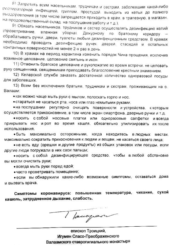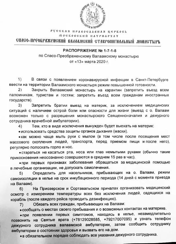 Для насельников, прибывающих на остров, предписывается самоизоляция в кельи на 14 дней.