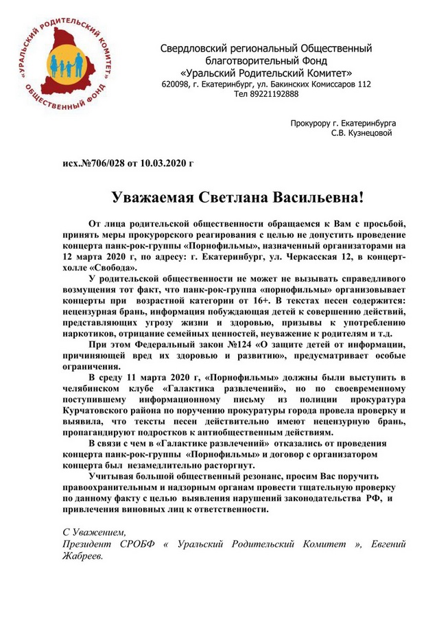 НУЖНО БОРОТЬСЯ... Очередная победа родителей: В Челябинске отменили концерт группы «Порнофильмы»Группа «Порнофильмы» планировала 11 марта дать концерт в культурно-развлекательном комплексе «Галактика развлечений». Но руководство заведения после обращения родителей и начавшейся проверки прокуратуры отказало в сотрудничестве. Аналогичная ситуация назревает и в Екатеринбурге, где в органы власти уже также поступило аналогичное обращение родительского комитета. "Прокуратура Курчатовского района провела проверку по поручению прокуратуры города. Им поступила информационное письмо из полиции о том, что в «Галактике» будет организован концерт, возрастная категория — 16+, — прокомментировала заместитель прокурора Курчатовского района Галина Соколец. — Тексты песен содержат нецензурную брань, информацию, побуждающую детей к совершению действий, представляющих угрозу жизни и здоровью, призывы к употреблению наркотиков, отрицание семейных ценностей, неуважение к родителям. При этом Федеральный закон №124 «О защите детей от информации, причиняющей вред их здоровью и развитию» предусматривает некоторые ограничения. Им запрещается пропаганда насилия, жестокости. В связи с этим мы начали проверку, но нам была предоставлена информация о том, что договор с организатором концерта расторгнут". В свою очередь в Екатеринбурге с призывом о запрете концерта выступил Уральский родительский комитет, обратившийся с письмом к прокурору города (см. скан). «У родительской общественности не может не вызывать справедливого возмущения тот факт, что панк-рок-группа «Порнофильмы» организовывает концерты при возрастной категории 16+», — говорится в обращении за подписью президента Уральского родительского комитета Евгения Жабреева. — В текстах песен содержится нецензурная брань, информация, побуждающая детей к совершению действий, представляющих угрозу жизни и здоровью, призывы к употреблению наркотиков, отрицание семейных ценностей, неуважение к родителям и т. д.» ![]() Дополнительная информация по теме: Зачем отменять концерты аморальных групп: 1. Если вам удастся отменить 2-3 концерта аморальных исполнителей в своём городе, то все региональные промоутеры, потеряв уйму личного времени и денег, в следующий раз 10 раз подумают, прежде чем приглашать к вам Фейса, Элджея, Хаски и прочих фриков. 2. Если отменить концерт одного исполнителя в нескольких городах (а с каждой отменой в одном городе, вероятность отмены в другом увеличивается), то скорее всего, этим исполнителем вообще не захотят заниматься промоутеры. Слишком много накладок и рисков. 3. Региональные органы власти в лице конкретных чиновников (у большинства из которых также есть дети) обратят внимание на то, как подросткам и молодёжи прививают деструктивные смыслы через аморальную музыку. 4. В случае придания факта отмены концерта огласке в СМИ, широкая общественность обратит внимание на то обстоятельство, что наиболее раскрученный среди молодёжи музыкальный контент носит вполне определенный деградационный характер. Это будет способствовать выработке у общества методологии распознания и противодействия таким деструктивным влияниям. 5. Организаторам концертов и самим рэперам придётся задумываться о том, какие смыслы они транслируют массовой аудитории через свою музыку. Чем больше
