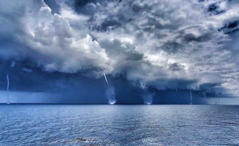 Однако, сейчас торнадо собирались не по 4-5, а по десять или более штук, причем не на одном пляже, а в разных местах Мексиканского залива: ![]() В прессе опять фурор, который сначала слегка омрачался страхом перед формированием большого тропического циклона, когда несколько хоботов начнут сливаться в один, но дальше началось кое-что похуже: ![]() Это фото с озера Мичиган, сделанное 21 августа 2020 года – торнадо в кадре более 10-ти штук, хотя четко видимо только 9, о которых все сейчас пишут. Штат Мичиган – это еще не Аляска, но уже и не Мексиканский залив, там не может быть никаких тропических циклонов в принципе, поэтому климатологи озадачены и вместо ответа на вопрос постят такие картинки: