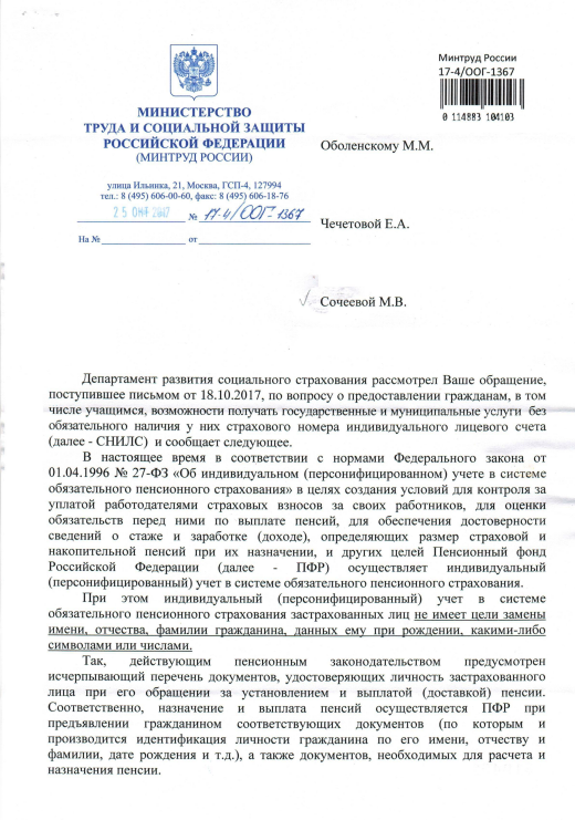 МОЖНО БЕЗ СНИЛСа... Официальный ответ Минтруда о праве граждан РФ подавать заявления и документы в госорганизацииОфициальный ответ Минтруда и соц.защиты о том, что граждане РФ при обращении за госуслугами имеют право подавать заявления и документы в бумажном виде, а отсутствие СНИЛС не является основанием для отчуждения или ограничения их основных конституционных прав. ![]()