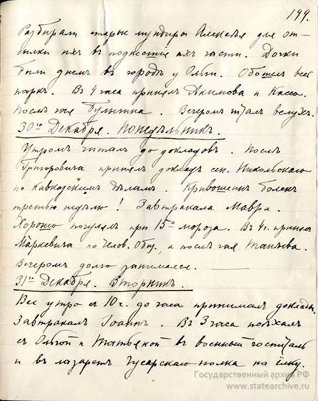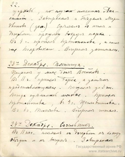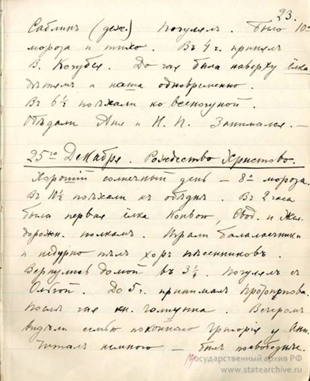 РОЖДЕСТВО ХРИСТОВО В ЦАРСКОЙ СЕМЬЕ... «Благослови, Господи, Россию и нас всех миром, тишиной и благочестием!»![]() Рождество Христово один из главных Христианских праздников, установленный в честь рождения во плоти Иисуса Христа от Девы Марии. Император Николай Александрович, как муж и отец, впервые встречал Рождество в Зимнем Дворце в декабре 1895 г. 24 декабря он записал в дневнике: «В 6 1/2 пошли ко Всенощной и затем была общая ёлка в Белой комнате. Получил массу подарков от дорогой Мама́ и от всех заграничных родственников». 25 декабря: «В 3 ч. поехали в Придворный Манеж на ёлку Конвоя и Сводного Батальона. Как всегда были песни, пляски и балалайки. После чаю зажгли маленькую ёлку для дочки и рядом другую для всех женщин, Аликс, и в детской». 26 декабря: «В 2 1/2 ч. отправились в Манеж на ёлку второй половины Конвоя и Сводного Батальона. После раздачи подарков смотрели опять на лезгинку и пляску солдат». 27 декабря: «Была «ёлка офицерам». С 1904 года праздник Рождества отмечался в Александровском Дворце Царского Села. ![]() ![]() ![]() ![]() Из дневника Императора Николая II от 31 декабря 1913 г.: «Вторник. … В 3 часа поехал с Ольгой и Татьяной в военный госпиталь и в лазарет Гусарского полка на ёлку. … Читал весь вечер и отвечал на телеграммы. В 11 ½ веч. поехали в полковую Церковь на Новогодний Молебен. Благослови, Господи, Россию и нас всех миром, тишиной и благочестием!». Из личного фонда Императора Николая II: Ф. 601. Оп. 1. Д. 260. Стр. 199-200. В 1916 году Император Николай II записал: «24 декабря. Сочельник. … До чая была наверху ёлка детям и наша одновременно…». «25 декабря. Рождество Христово. Хороший солнечный день – 8 градусов мороза. В 10 ½ поехали к Обедне. В 2 часа была первая ёлка Конвою, Сводному и Железнодорожному полкам. Играли балалаечники, и недурно пел хор песенников». (Ф.601. Оп.1. Д.265. Стр.22-23). Татьяна Мельник-Боткина: «В течение всей войны, каждое Рождество и Пасху, всем раненым Царскосельского района выдавались великолепные подарки на личные средства Их Величеств, — как например, серебряные ложки и вилки с гербом, и кроме этого, еще устраивались ёлки с угощением. Их Величества не ограничивались общественной благотворительностью: значительные суммы раздавались нуждающимся раненым так что, наверно, многие из них и не подозревали, откуда идет им помощь. Еще менее знали об этом в обществе, так как это шло иногда через моего отца, иногда через других лиц, умевших хранить секреты. Между прочим, помогала в этом деле и Вырубова — человек очень щедрый и отзывчивый к чужому несчастью, благодаря чему, после того, как во время революции ее выпустили из тюрьмы, она, желая избежать вторичного ареста, находила приют в подвалах и каморках бедняков, когда-то вырученных ею из нищеты». ![]() Ёлка в детской половине Дворца. impersem.kuvat.fi А.А. Танеева: «Мало-помалу жизнь во Дворце вошла в свою колею. (После убийства Г. Распутина. Прим. Л.Х.). Государь читал по вечерам нам вслух. На Рождество были обычные ёлки во Дворце и в лазаретах; Их Величества дарили подарки окружающей свите и прислуге; но Великим Князьям в этот год они не посылали подарков. Несмотря на праздник, Их Величества были очень грустны: они переживали глубокое разочарование в близких и родственниках, которым ранее доверяли и коих любили, и никогда, кажется, Государь и Государыня Всероссийские не были так одиноки, как теперь. Преданные их же р