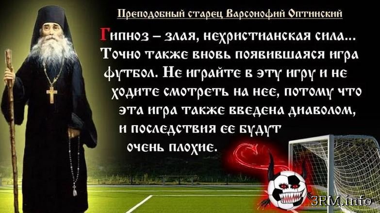 ПОЛНОЕ ПОМРАЧЕНИЕ... Митрополит РПЦ МП предложил ввести каппелана для проигравшей футбольной сборной![]() Прим.Ред. - Дорогие во Христе братья и сестры! Когда читаешь эту новость, то возникает глубокая скорбь на сердце. Ведь это целый митрополит нашей РПЦ МП, и он не только не хочет руководствоваться святыми отцами, но и идет против них и Христа. Богомерзкий и осуждаемый Церковью футбол он предлагает взять под её окормление. Ведь первое, что должен сделать духовник футболиста - это убедить его уйти из этой богомерзкой сферы деятельности. Зачем это лжп.Кириллуи его сановным подельникам? Для поднятие значимости его самого и его легиона предателей Христа в глазах антихристовой власти. Ну, и конечно для получения денег, которые должны политься в карманы футбольных "каппеланов". Наверняка они мечтают о большем. Даешь духовников во все трудовые и спортивные коллективы страны! Как уместен был бы духовник в каком-нибудь институте эволюционной или молекулярной биологии! А как уважаем был бы главный духовник Газпрома! А главный духовник Совфеда или Совбеза? Очень нужен свой духовник телеканалу Рен-Тв. Без духовника недостаточно ароматен ежевечерний соловьиный помет. В общем, всюду нужен духовный контроль и учет и мудрое слово товарища церковного комиссара. Не ради Христа и спасения души, а ради власти и денег. Господи помилуй! ![]() ![]() Сборной России по футболу, которая вылетела с чемпионата Европы-2020, заняв последнее место в группе B, необходимы духовники от РПЦ МП. С таким заявлением выступил 1 июля председатель патриаршей комиссии по вопросам физкультуры и спорта Московского патриархата митрополит Мурманский и Мончегорский Митрофан (Баданин) - на фото выше (яблочко от яблони не далеко падает), передаёт RTVI. "Должны быть духовники в нашей сборной, обязательно заниматься окормлением наших ребят. Тут именно недостаток духовной практики: они какие-то небоевые, духовно, мне кажется, слабенькие, немотивированные", — сказал митрополит. ОЧЕРЕДНОЕ ФУТБОЛЬНОЕ БЕСНОВАНИЕ... Не оскверняйтесь богомерзкими ресталищами Прим.Ред. - Дорогие во Христе братья и сестры! С 11 июня и до конца Петровского поста будет проходить очередной чемпионат мира по футболу, который наши святые отцы называли дьявольской игрой. Тем не менее, апостасийное и богоотсупническое духовенство во главе с лжм.Кириллом (Гундяевым) призывают даже молиться об игроках. Вспомните ЧМ-2018. REGNUM. Патриарх Московский и всея Руси Кирилл надеется, что чемпионат мира по футболу в России пройдёт успешно. Об этом предстоятель церкви сказал на открытии заседания Высшего церковного совета в Москве. Также он выразил свою надежду на достойное выступление на чемпионате сборной России и призвал «надеяться и молиться» об этом. В то же время, подчеркнул патриарх, следует рассчитывать, что российские футболисты подобающим образом подготовились к непростому испытанию. А по окончанию этих сатанинских ристалищ лжп. Кирилл поздравил сборную России по футболу с успешным выступлением на Чемпионате мира. «Достигнутые успехи стали убедительным свидетельством высокого профессионализма тренера и спортсменов, целеустремленности игроков, командного духа, а также воли к победе», — подчеркивается в его поздравлении. Особо он отметил «роль болельщиков, оказавших исключительно важную поддержку национальной сборн