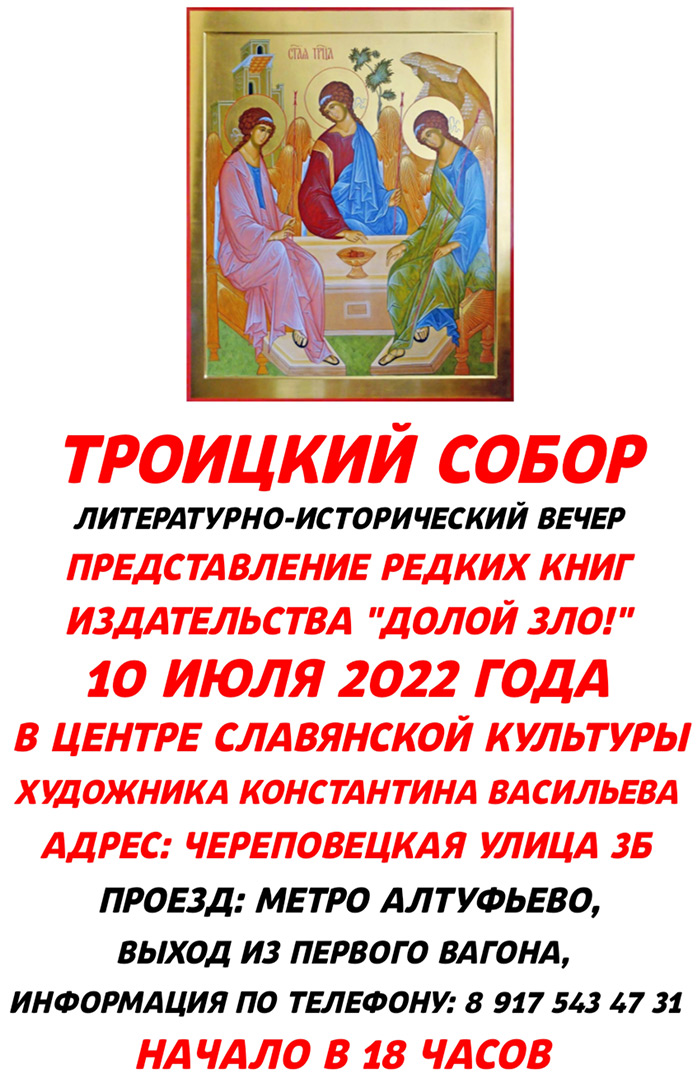 ОБЪЯВЛЕНИЕ. 10 июля года, в воскресенье, в Москве, состоится Православное мероприятие![]() Дорогие друзья! 10 июля года, в воскресенье, в Москве, состоится Православное мероприятие, посвящённое возрождению известной патриотической организации 90-х годов ТРОИЦКИЙ СОБОР. Вечер пройдёт в музее художника Константина Васильева, в Алтуфьево. Участвуют общественные деятели, поэты, писатели, авторы-исполнители, незапятнанные сатанинским официозом и соучастием в тайне беззакония. Будет представлена редкая патриотическая литература 90-х, начала 2000-х годов. Ждём всех людей доброй воли, неравнодушных к судьбам Православия и России. С Богом!