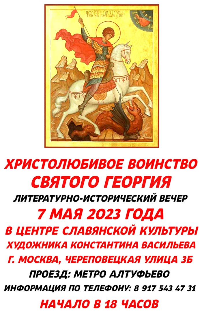 ОБЪЯВЛЕНИЕ. Москва. Литературно-исторический вечер в Центре славянской культуры![]() Дорогие друзья! "Поистине, никогда ещё не был так тяжёл крест каждого, желающего быть истинным Христианином, как в переживаемое нами время торжества лжи." Архиепископ Аверкий (Таушев). В апокалиптическую годи́ну всеобщего разложения и беснования жгуче актуален безценный опыт Христолюбивого Воинства И́стинствующей Церкви по преодолению всевозможных козней и ухищрений сатанинских! Оторвать задницу от удобного советского дивана и, осенившись крестным знамением, заглянуть за кулисы мировой драмы, взглянуть страшной правде в лицо, перестать быть попугаем гробальной сатанократии или позорной крысой, разве это не подвиг для современного обывателя?! В каком законе прописано, что Христиане (Христиане!!) должны быть идиотами, дебилами, терпилами, рабами Лжи, половыми тряпками??!! Стоит ли "бежать впереди паровоза"?! Да и за "паровозом" таким не стоит бежать! Всех Боголюбцев и людей доброй воли приглашаем на литературно-исторический вечер, посвящённый покровителю Христолюбивого Воинства Святому Великомученику Георгию Победоносцу! В программе живые лекции по истории и начальному Богословию, выступления Православных поэтов, музыкантов, авторов-исполнителей. Оргкомитет.