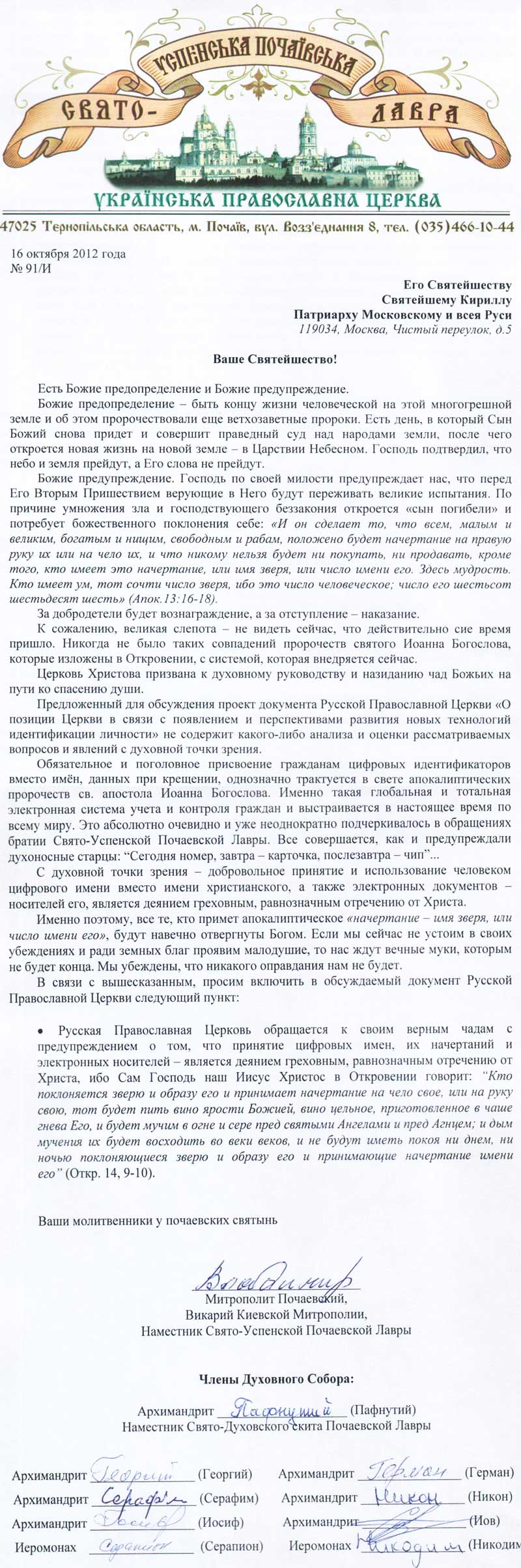 Также митрополит Владимир и отцы Почаевской Лавры конкретно высказались по вопросу развития новых технологий идентификации личности. Как известно, в РПЦ МП в мае сего года запущено "обсуждение" проекта документа проект документа Русской Православной Церкви «О позиции Церкви в связи с появлением и перспективами развития новых технологий идентификации личности».