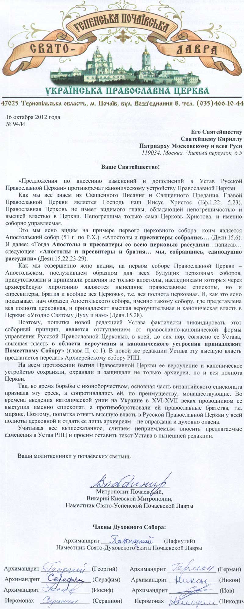 Обращение братии Лавры к Патриарху Кириллу по Уставу РПЦ МП 16 октября 2012 года № 94/И Его Святейшеству Святейшему Кириллу Патриарху Московскому и всея Руси