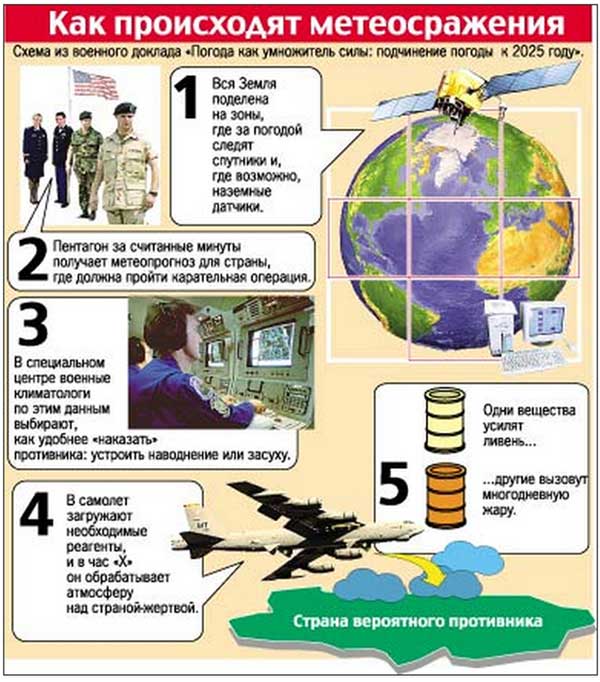 5. Одни вещества усилят ливень, другие вызовут засуху. ![]() Вывод из этой концепции таков, что военные видят атмосферные аэрозоли как боевое ударное средство. Рассмотрим более подробно этот вопрос.