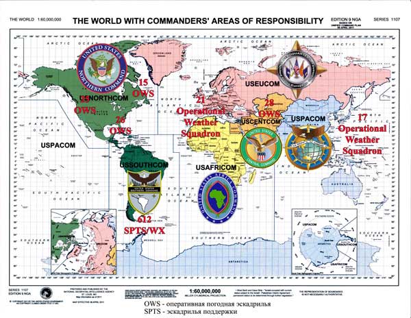 1. Сегодня вся планета поделена на зоны – возможные театры военных действий. Боевые операции осуществляет ответственное за эту зону командование, а подготовку метеоданных для этих операций осуществляют оперативные погодные эскадрильи (OWS). Прогноз по Европе, России, Украине и странам Африки осуществляет 21 OWS (Оперативная Погодная Эскадрилья). ![]() 2. Военная метеослужба США ведет круглосуточный сбор метеоданных со спутников и из всемирной погодной сети, в которую включен и Росгидромет. Объем метеоданных составляет около 1 терабайта информации в сутки. Прогноз делается каждые сутки.